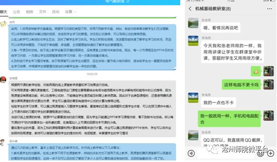 电气和机械基础教研室分别以微信群和QQ群的形式召开了研讨会,老师们对线上教学谈了自己的认识和经验,也对线下如何跟进进行了了讨论。张翠英副教授在研讨会上分享了自己的经验:“提前两天通过雨课堂群发公告和QQ课程群同时发布线上教学内容的课前、课中、课后任务书。课上主要针对本次教学任务的重难点进行讲解,鼓励学生利用【投稿】功能具体描述不懂的内容。就每次课的知识点发送几道选择题,限时时间1-2分钟不等。课后通过与学生QQ分享屏幕的教学方式讲解学生不懂的知识点,同时把腾讯课堂作为雨课堂的辅助。”