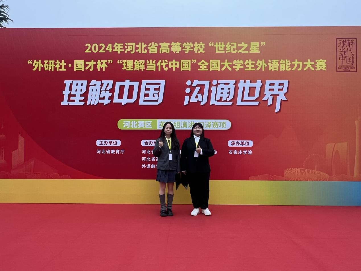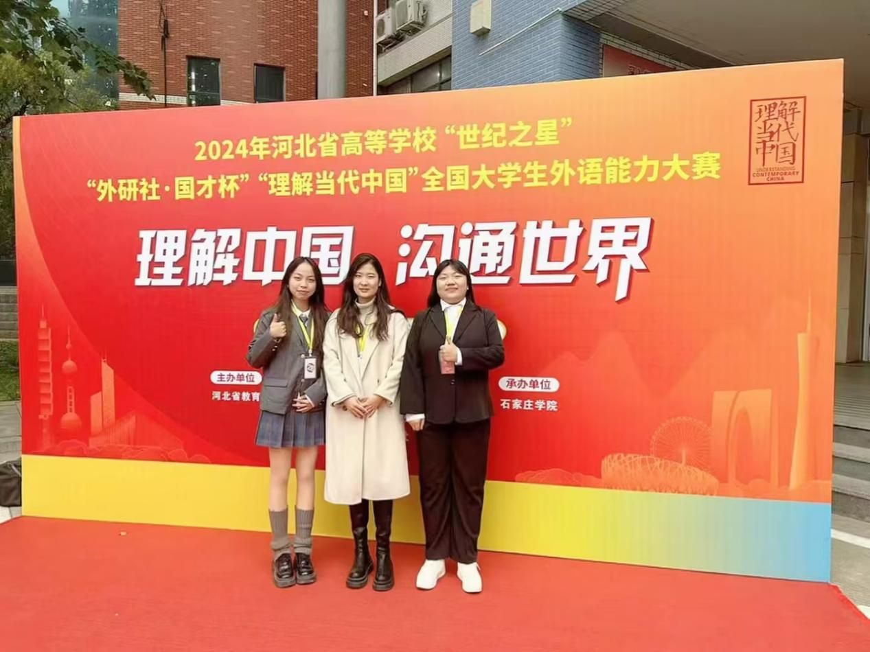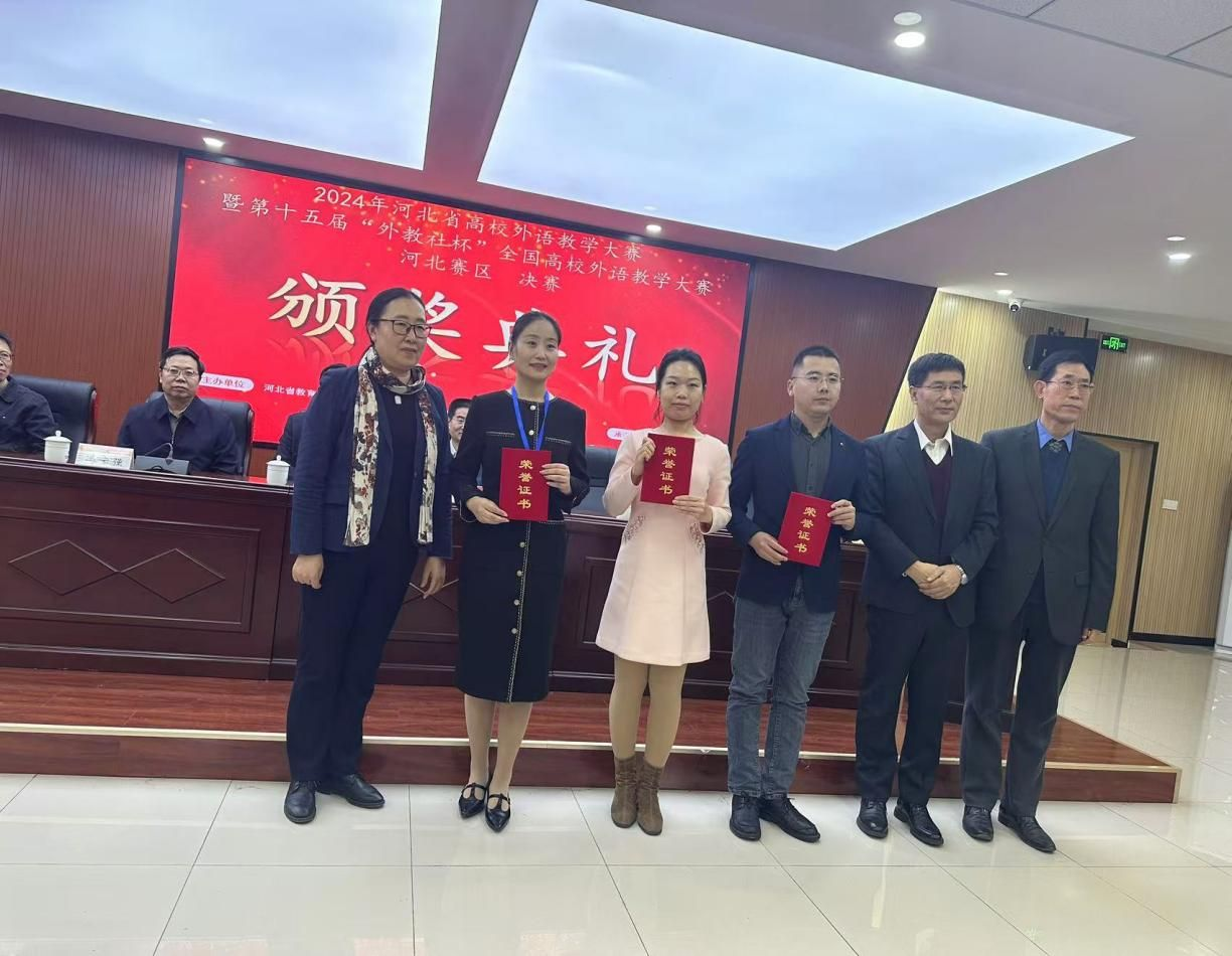 在“外研社·国才杯”“理解当代中国”全国大学生外语能力大赛河北赛区决赛中,徐丹(指导老师:胡萍)荣获本科及硕士研究生组英语演讲赛项银奖;唱蕊薪(指导老师:王靖雯)荣获英语组演讲赛项铜奖;徐萍(指导教师:李华华)荣获英语组演讲赛项铜奖;唱蕊薪(指导老师:陶阳)荣获英语组口译赛项铜奖。