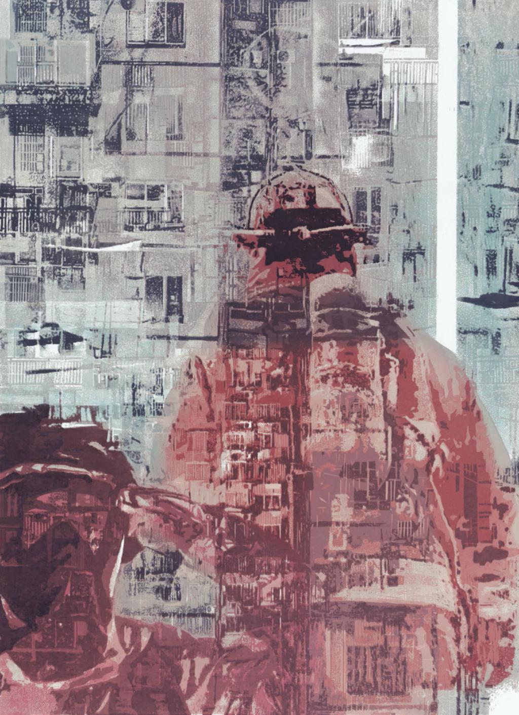 这幅作品采用迷彩色块叠加的形式,以蓝灰为主色调,结合抽象与具象的表现手法,展现了队列行进的军人形象。画面中红色五角星与军徽标志成为视觉焦点,象征着忠诚、荣誉与使命。灰蓝相间的色块不仅表达了军装的统一性,也烘托出军队秩序与纪律的庄严感。作品通过模糊的人物轮廓与抽象的细节,表现出个体在集体中的隐匿与融合,传递出“集体意识高于个体”的主题。这幅作品不仅是一种对军人精神的致敬,更蕴含着对秩序、力量与责任的思考。