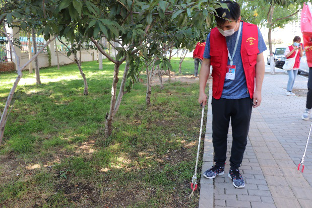 志愿者们在接受到安全知识教育和安排后积极投入到志愿服务活动中,在谷书记的带领下,教师和学生党员分被成两两一组,分布在两个路口。一部分志愿者手持卫生工具,进行打扫;另一部分志愿者手提垃圾袋,回收垃圾。在烈日骄阳下,穿戴着“沧州师院志愿者”外套的志愿者们展现了高度的社会责任感和昂扬的精神面貌,俨然成为了路边一道别样的“风景”。他们的行为也得到了周边居民的一致好评。