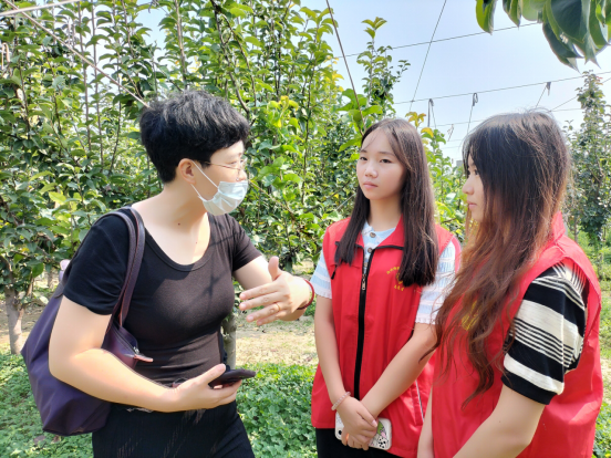 到达目的地后,由金孟园农村合作社的销售负责人带领一行人前往梨园种植基地进行参观。精准管理下浑圆个大、鲜艳诱人的秋月梨,引得领导、老师以及同学们的声声感叹。规模化、科学化管理模式下的秋月梨种植,让大家大开眼界。随后销售负责人讲述了梨园种植基地中梨的品种、育苗技术及生长周期,感受梨园智能化绿色生产。同时负责人希望同学们能将自己所学的专业知识运用到实践中,发挥专业力量,让越来越多优质的农产品被推广在电商平台,实现收益与乡村振兴的统一。同时据介绍,梨园种植基地正通过租地带动、订单农业带动、吸纳就业带动等多种方式,有力地推动了周边现代农业发展,盘活了农村闲置资源,解决了一批农户的就业。