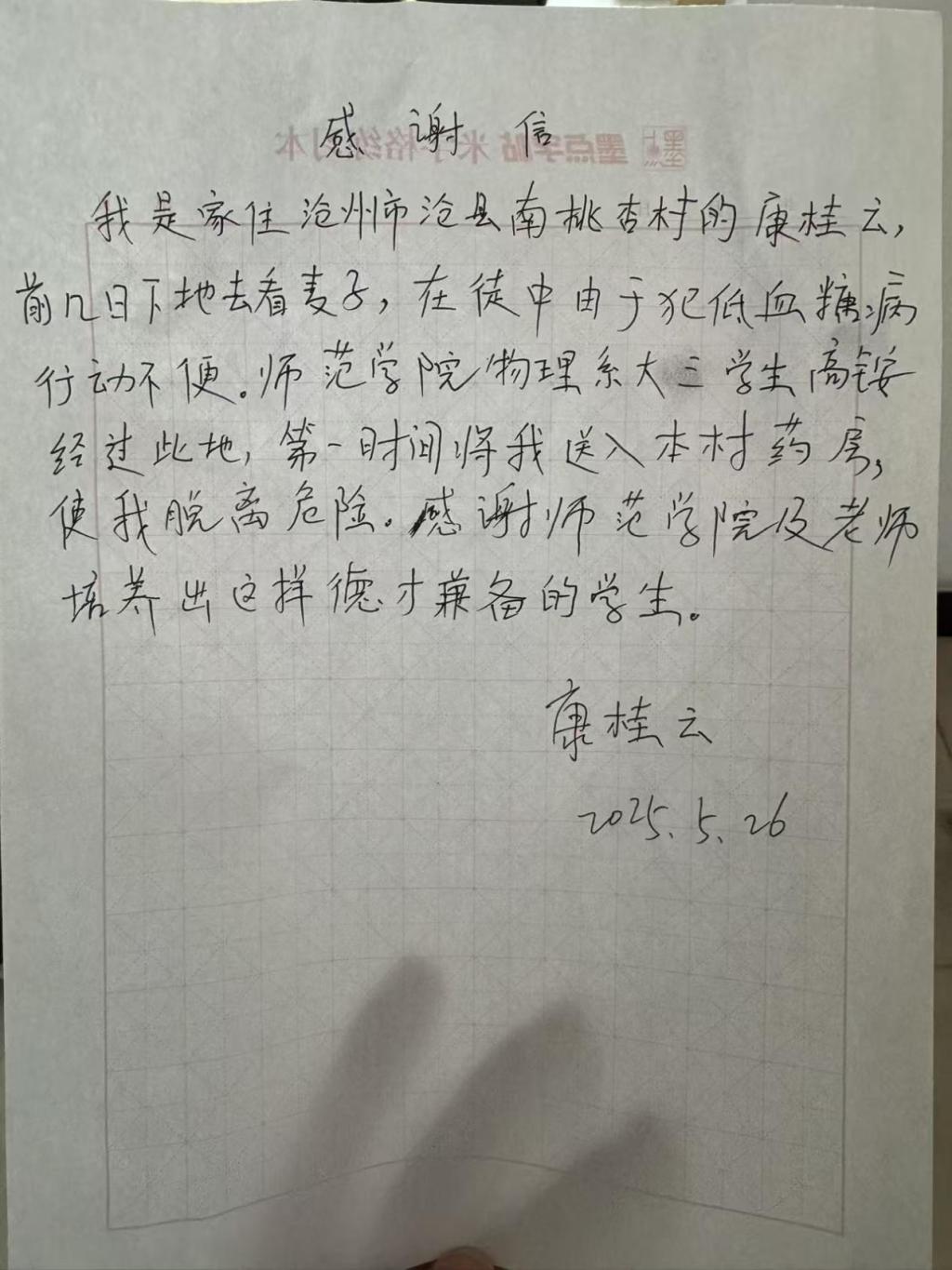 近日,家住沧县南桃杏村的康桂云下地查看麦子时,突发低血糖,行动受限,陷入危险境地。高铵同学途经此地,没有丝毫迟疑,果断伸出援手,争分夺秒将康桂云送至本村药房。在及时的专业救助下,康桂云脱离危险。这份危急时刻的果敢相助,彰显着高铵同学心底的善良与担当。最后被救者康桂云怀着感恩之心,为高铵同学送来了锦旗与感谢信。锦旗上熠熠生辉的字句,感谢信中情真意切的言辞,都是对高铵善举最诚挚的认可与褒奖。