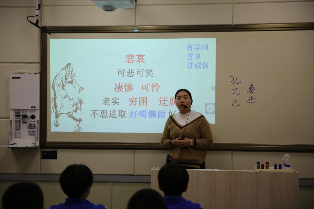 首先由第八中学青年教师牛艺静讲授《孔乙己》示范课。牛老师以“哀”为线索,从“自身”“他人”“社会”三方面入手分析孔乙己的性格特征及其在凉薄的世界被人嘲笑、被人毒打直至凄凉死去的悲惨命运。通过对背景、人物、情节、环境等的分析,以及对精彩段落的反复诵读,让学生真切地感受到孔乙己不单纯地是一个迂腐的知识分子,他已成为鲁迅救国救民、振臂呐喊的具象,体现出当时鲁迅对底层平民“哀其不幸”的幽愤情感和对国民性问题的深刻思考。牛老师在授课过程中通过设问启发、巧妙拓展、关键词句讲解、回顾总结等多种教学手段,由浅入深、层层递进引导学生独立思考、分析和解决问题,同时潜移默化塑造了学生的价值观。